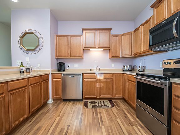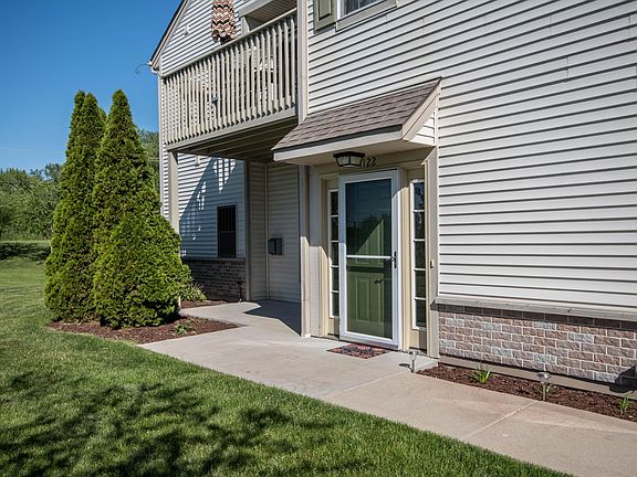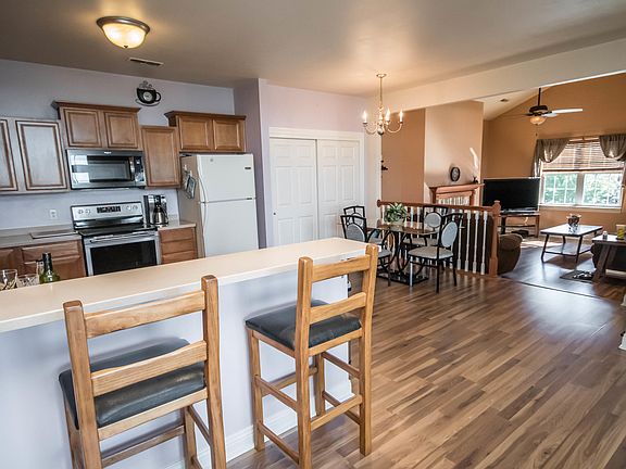 Well maintained 2nd owner UPPER End Unit on a quiet cul-du-sac has attached 2 car garage. Corian counters & Maple cabinets in large kitchen with snack bar. Open living areas with Wood laminate floors, 9' ceilings & neatly painted. Marble vanity tops in both large bathrooms (one has tub & master walk-in shower). Family room with vaulted ceilings & gas fireplace. 3rd bedroom with large closet off family room can be used as a bonus room. (add door for use as a 3rd bedroom). Other 2 bedrooms on other side of condo. Private entry from garage or front door. Has Balcony with a view for relaxing or entertaining. Clubhouse has kitchen, fireplace & large gathering area that can be rented for parties, fitness center and pool/hot tub. Condo dues include lawn maintenance, snow removal & unit's water.