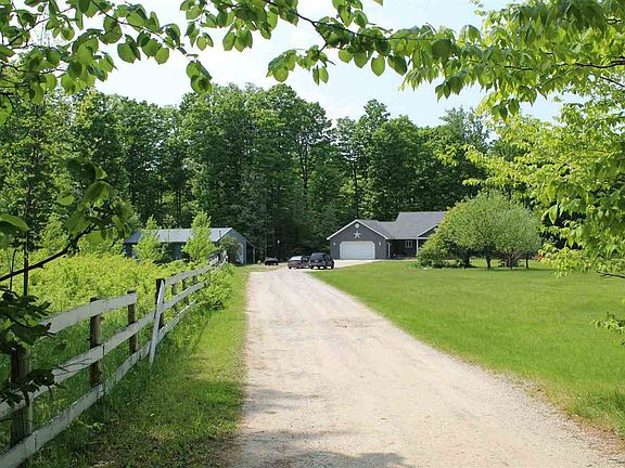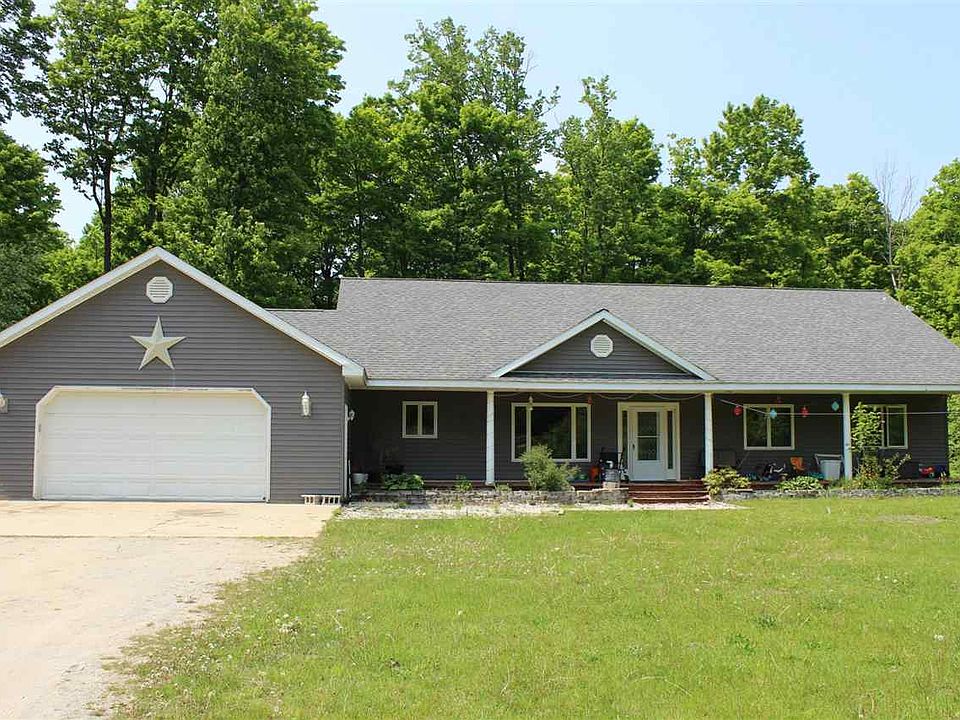 Beautifully situated 4 bed/3 ½ bath home on 10 private acres just outside of Petoskey and within a quarter mile of 200 acres of State Land. This spacious home features hardwood flooring, cathedral ceilings, main level en-suite master, eat-in kitchen and formal dining room. An abundantly windowed, tongue and groove family room perfectly frames the varied landscape- beautiful hardwoods and trails in the back, with nice open gardening areas in the front. Producing apple and pear trees, along with TONS of raspberry and blackberry patches are on property. The partially finished walk-out basement easily doubles your living space and provides a great recreation area. Pole barn with heated workshop, tiki bar, efficient outdoor wood boiler and converted chicken coop all add to this properties practical, yet fun atmosphere. This home and property present a retreat atmosphere and is still bursting with further potential.