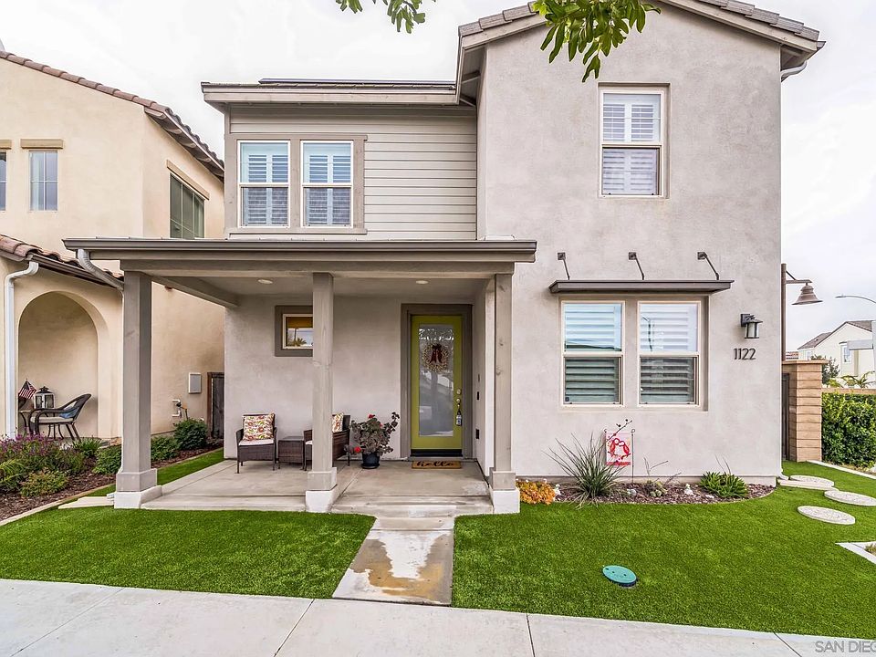 Welcome to the vibrant Village of Escaya in Otay Ranch! Nestled in a newer master planned community, this corner lot home boasts a prime location with only one neighbor to the side, and the convenience of an elementary school across the way and a community park nearby. Built in 2018, this home embraces the indoor/outdoor SoCal lifestyle with its open-concept floorplan & ample windows flooding the space with natural light. Smart & energy-efficient features such as a Ring doorbell, Smart Thermostat, and smartphone-controlled security system enhance convenience. Inside, you'll find a primary suite with an ensuite, along with two additional bedrooms on the second level & one bedroom on the first level. With 2.5 bathrooms, a Dining Room, spacious Family Room, laundry room, shutters throughout, and vinyl plank flooring on the first level, this home offers both style & functionality. The modern Kitchen is a chef's dream, featuring white shaker cabinets, a large center island with granite countertop, and stainless steel appliances. Additional conveniences include Water Osmosis, Insta Hot water, and Water Softener systems, catering to the needs of today's modern family. Outside, the private side yard with artificial turf is perfect for entertaining family & friends. Come experience the charm and comfort of this beautiful home – Welcome Home!
