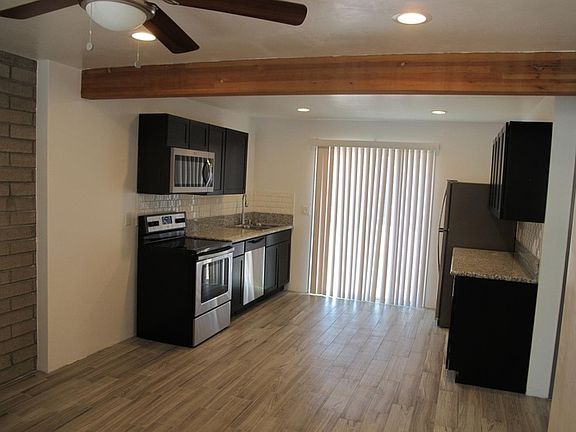 PRE-LEASING FOR FALL 2025! Lease must go through July 25, 2026. This three bedroom, two bathroom home features wood-plank tile, carpeting and vinyl wood flooring throughout. Exposed wood beams and brick offer a unique feel on this upgraded home. The bright and open kitchen boasts stainless steel appliances, a decorative back-splash, granite counter tops and custom cabinetry. Recessed lighting and ceiling fans throughout. A split floor plan with a full bath on the first floor for convenience. Air Conditioning with an additional mini split air conditioning system on the first floor. Enjoy the spacious privately fenced in back yard. Washer/Dryer hook ups! Off-Street parking available. $75 flat water fee per month. Quick access to I-10! Minutes from the U of A, Historic 4th Avenue and Main Gate Square. Pets upon owner's approval with $200 non-refundable pet fee. Security Deposit is equal to one month's rent. Contact us to schedule a showing.
