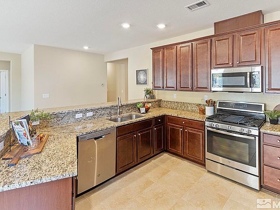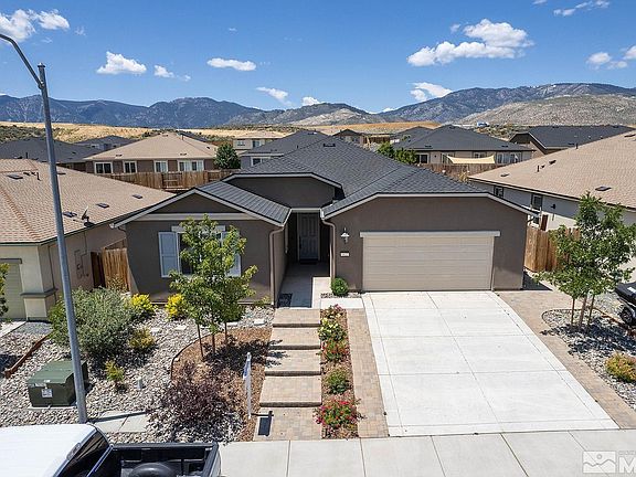 Light, bright and beautiful - this gorgeous home in desirable Schultz Ranch of Carson City is in immaculate, ‘like new’ condition - actually better than new! It is the floorplan everyone wants with 4 bedrooms and a separate office plus a generous 3-car garage. OPEN HOUSE: SAT., 9/9/23, 11:00am - 1:00pm!!!!!, Tile floors throughout, bedrooms have high-grade carpet and padding, and there’s a top-quality new barn-door for privacy to the main bathroom from bedroom. The spacious slab-granite kitchen has a new GE refrigerator. Elegant wood blinds adorn the windows. Smart features of the home include Ring doorbell, digital Honeywell thermostat, hub for wireless and USB charging stations. The home features an energy-efficient recirculating hot water system – no more replacing water tanks. The beautiful pavestone walkway to the front door adds elegance and extended pavers widen the driveway and sideyard walkway, a big plus to this property. The paver backyard is covered with a low-maintenance Alumawood patio cover. The planter areas host a variety of fruit trees and roses, and there’s another 10’ x 20’ garden area awaiting your green thumb. All on an automatic watering system. Another plus – No HOA!