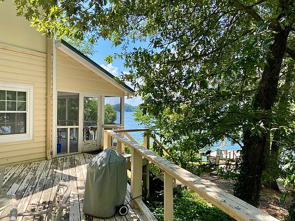 Great Waterfront home !! Great condition, ready for you to grab your fishing pole, and hit the lake. Home sits back on the water, you cant even see it from the street, so private. Come onto the circular driveway around the tall trees in the yard. Going right into the door, you feel right at home. As soon as you walk in, you immediately see the WATER ! The great room has the living area, kitchen, and dining room all together, with large windows facing the lake, and door to the full length screened porch. Down the hallway, you have a full bath, and one bedroom that also has doors to the screen porch. Up the stairs, you'll find one bedroom to your left, utility room to your right, and into a HUGE bonus room, with BIG windows facing the lake.. Also, theres another bath, and an oversized bedroom to accommodate several extra guests. Property offer a covered dock, additonal deck off of the dock, fire pit area, 100' of year round waterfront, and a large deck on the end of the home, all shaded with huge shade trees. Almost from anywhere you are in this home, you see WATER. Theres an additional outbuilding on the property also. Grab your Ruby Red slippers !!!! Theres no place like THIS home !!!