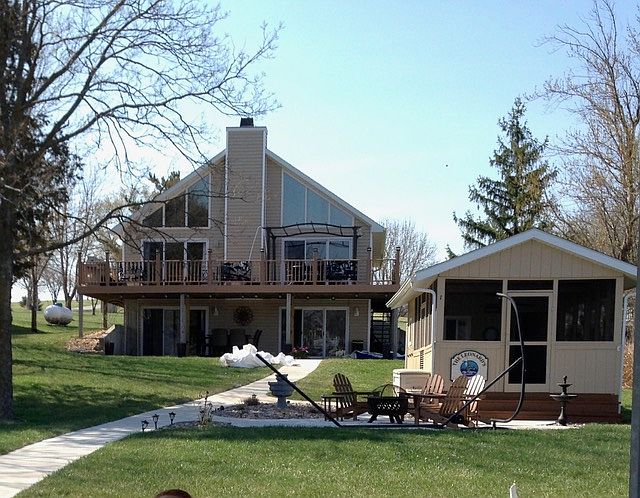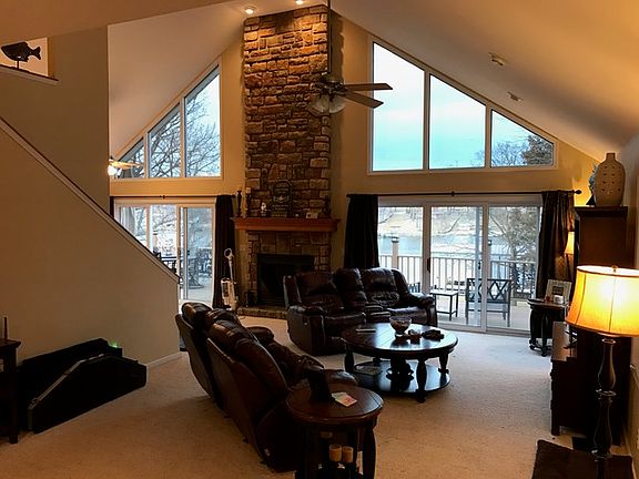 Beautiful lake front home located on deep/wide cove behind the no wake. Four bedrooms plus large loft (easily fits 2 queen beds), two full bathrooms, large eat in kitchen, living room, family room, game room, wet bar, plenty of storage, large maintenance free deck, large patio, screen enclosed boat house with lockable storage area, lake side fire pit patio, double slip concrete dock with jet ski lift. All has been very well maintained and best location on the lake! Extended waterfront due to positioning of the home and location. Large FLAT lot. Must see!
