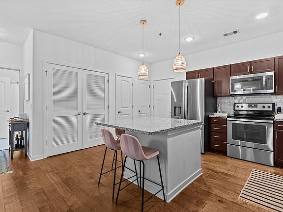 Stunning condo melding modern design with classic craftsmanship. Features an open layout with 9-foot ceilings, expansive walk-in closets, and elegant granite countertops. Luxurious Carrara marble floors in the bathrooms and custom hardwood throughout underscore a dedication to upscale living. Enjoy serene moments on the spacious, private balcony of this desirable corner unit. Details like a subway tile backsplash and walnut cabinetry add timeless appeal. Perfectly located just steps from East Nashville's vibrant scene and downtown. A sophisticated home offering everything you desire!