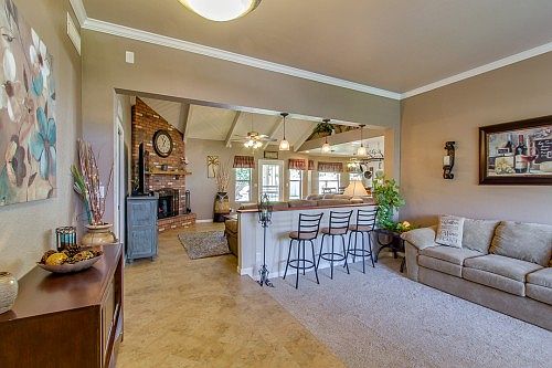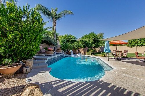 Wow. Beautifully updated 4bed/2bth home with and open floor plan, tile floors and crown molding. The gorgeous, thick granite slab in the kitchen makes for an expansive breakfast bar. The kitchen ceiling is raised with recessed lighting leading to vaulted ceilings in the family room. The same granite is on the long counter in the laundry room which includes a sink and plenty of cabinets, don't miss the awesome Walk-in pantry. A breakfast nook is accented by the bay window overlooking the pristine yard where your private oasis awaits; a waterfall pool, full-length covered patio, pergola and grassy backyard. Both bathrooms are gorgeous with stylish vanities and granite tops, not to be outdone by the Luxurious walk in master shower retreat just updated last year. All this and more awaits you on a cul-de-sac street, near schools and NO HOA.