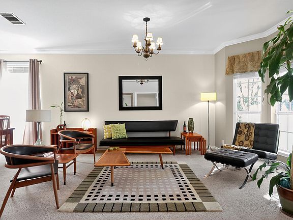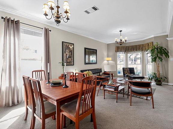 Open floor planHigh ceilingsAbundant natural lightTwo dining spacesMature trees