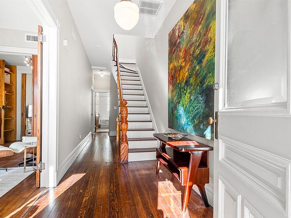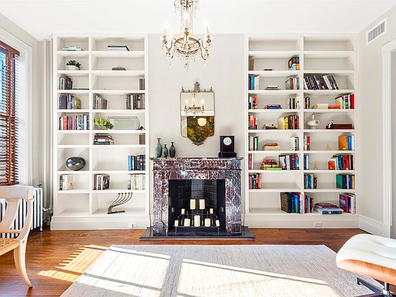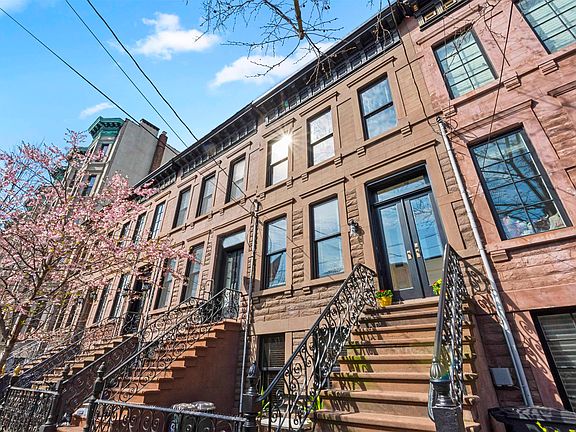 Perfection on Park. This exquisitely renovated four-level townhome is a stunning combination of old world magnificence and contemporary living. Impressive wide, true brownstone home with high ceilings and beautiful natural light throughout. The open concept garden level features a custom kitchen with a large island for gathering, a separate dining area, and a half bath. The exposed brick and hardwood herringbone floor offer the perfect background for entertaining. Exit through large, expanded French doors out to the home’s impeccably maintained garden with Ipe decking and bluestone patio. Entertain in the garden with built-in gas lines for grilling and fire pit. Truly fantastic for hosting friends and family or quiet moments. The second floor includes a full bath with tub and two bedrooms, currently used as an office and a den, both with built-in book shelves, connected by historic pocket doors and walk-in closet. In the back bedroom, double doors open onto a large, wrought-iron veranda overlooking the yard. Private and luxurious, the primary suite is situated on the top level and also includes a veranda, as well as a walk-in closet with a small kitchenette and full bath. This floor also boasts two additional bedrooms, currently used as an office and a meditation room. Additional highlights include a finished basement for entertaining, gym, washer/dryer room, and four large storage rooms. The house features a newly updated roof, new 2-zone AC, and a built-in elevator shaft (currently being used for storage on each floor), with architectural plans for future use. Welcome Home.