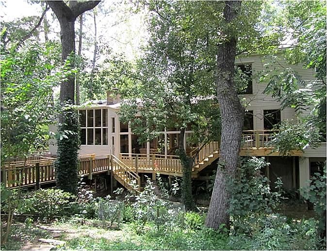 Frank Lloyd style house situated on gorgeous ravine lot. Spacious multileveled downst with spectacular view, luxury F/Pl, big kitchen area w/den, designers powder room, 3 car garage, 2 bedrooms upst. Separate master suite w/sitting room&view, master bath w/whirlpool, modern shower system; 2 walk-in closets. Upgraded amenities: wood floors, travertine,granite, onyx, surround sound & more. Additional 576 SQ F 1bedr/1bath house on property, 1500 sq.ft decking area. Memorial schools and Location!
