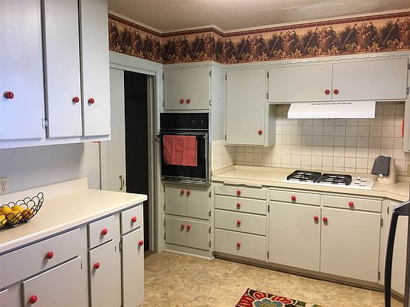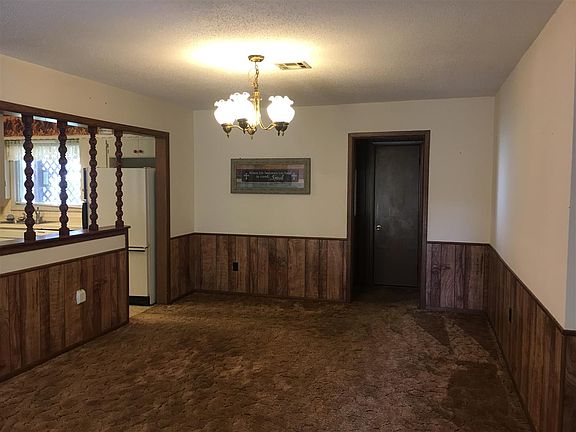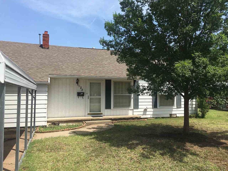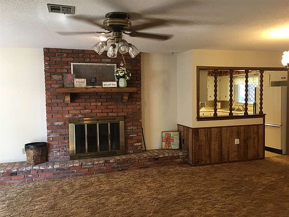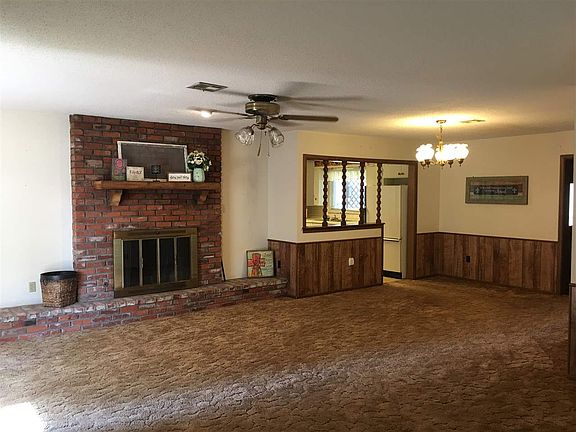 Excellent location!! Fresh paint in living area and SW bedroom. This 2BR/2B home has a carport and is close in proximity to the Middle and High School. The large living/dining room has a fireplace made with bricks from Blackwell. The garage has been converted in to a large utility room/pantry. Master bedroom has two large closets & bath with a stall shower. The fenced in backyard has a covered patio, storm shelter & metal insulated shop with electric and 2 other sheds for storage.