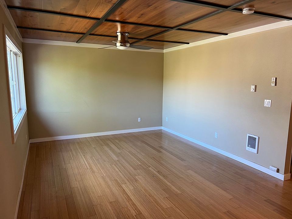 Wall mounted electric heatNice floor planBamboo floorsCeiling fanCarpet in each bedroomSmall private deckTile shower