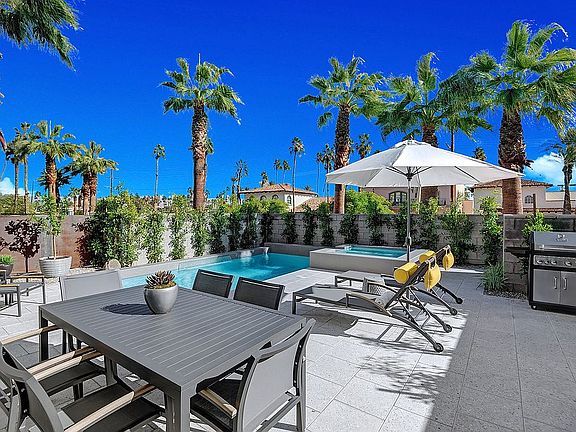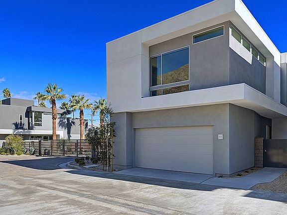 Builder model home. A clean and contemporary aesthetic is complemented by the mountains, which serve as a picturesque backdrop to the community. Home is equipped with its own pool and spa. In addition, the gated neighborhood provides a peaceful escape, while still being in a prime location. Highly upgraded, featuring top of the line finishes, including Viking appliances, Ceasarstone countertops, Porcelanosa tile, LaCantina bi-fold doors, Hans Grohe fixtures and much more.