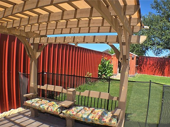 Welcome home to The Grove and this stunning property with an inground pool. Stay cool during the hot Texas Summers relaxing in your beautiful crystal clear pool. THE POOL IS GATED FOR SAFETY. The back yard is so inviting with an enclosed patio, concrete deck and covered seating area. The high fence offers privacy and a lovely backdrop to this manicured backyard retreat. Property has two separate out buildings for storage, a work shop or a gym as one is now used (with AC!).
