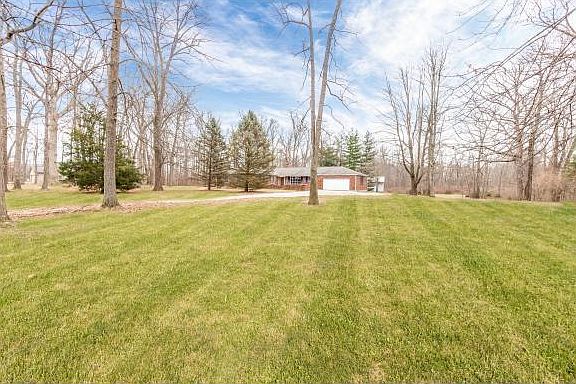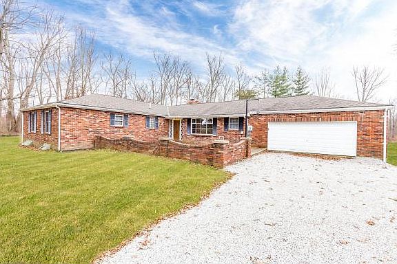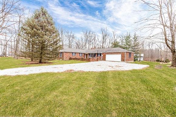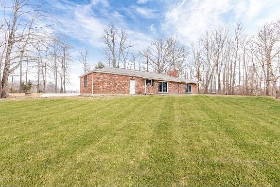 Large, 4 Bedrm, 2.5 bath brick ranch in St Leon. 1st floor living w/laundry room. Open foyer w/slate floor, 2 LRs, DR area w/hardwood floor, 3 FPs, freshly painted. Huge unfinished, walkout basement w/tons of potential. Subject to final survey, acreage estimated at 2 acres. Property sold 'As Is'.