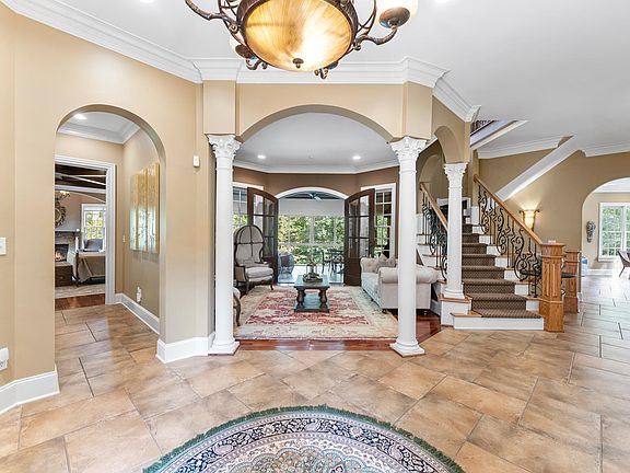 French Inspired Manor in gated community,2+Acre cul-de-sac with a huge Private Backyard backed to wood buffer. Chef's kitchen opens to a climate-controlled sun-room with a grill station and ample room for entertaining. First and second floor offices provide two private working areas. Master bedroom comes with sitting area and a luxury bath. Huge basement comes with kitchenette, bar, wine cellar, theatre room, exercise room & a guest suite. Backyard with room for a pool, predesigned by previous owner. 4 car garage, 5 fireplaces.