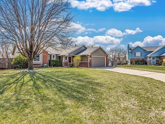 Don't miss this beautiful home located in the Goddard School District with the most amazing upgrades. This 5 bedroom 3 bath ranch home has so much to offer your family. The previous home owner took immaculate care and maintained the property diligently. Enjoy a lower electrical bill with all new Lo-E windows that were installed through out the entire home. A new sliding glass door was placed that takes you out to a gorgeous back yard with an extended newly poured patio area for a great cook out or to enjoy time relaxing. The home feels quiet and private with a beautiful tree line in the back yard just nestled in a great cul-de-sac lot. A newer roof with class 4 hail resistant shingles was installed. The exterior has new paint and new siding along the chimney wall and on the lower half of the house on the westside. As you enter the home, enjoy the feel of open concept with this spacious living room/dining combo with nice high vaulted ceilings. The living room offers a real wood burning fireplace and beautiful laminate wood flooring running through out the main level. Lots of natural light flows through and the space feels bright. Enjoy an open dining space that's positioned off the living room that offers plenty of seating for a large Holiday celebration. The Kitchen has a newer dishwasher and gorgeous granite counter tops with an all neutral calm color scheme. The Master bedroom is a good size with double closets and offers an attached master bathroom with a jetted tub/shower combo, along with a vanity for storage and counter space. There are 2 other bedrooms located on the main level. As you go downstairs from the front door to the basement, enjoy newer carpet installed and another real wood burning fireplace with a nice open living area for your guests to spread out and watch the game. With 2 more nice sized bedrooms and a bathroom, this makes such a cozy hang out. The laundry is also located in the basement. Don't miss the opportunity to see this home.