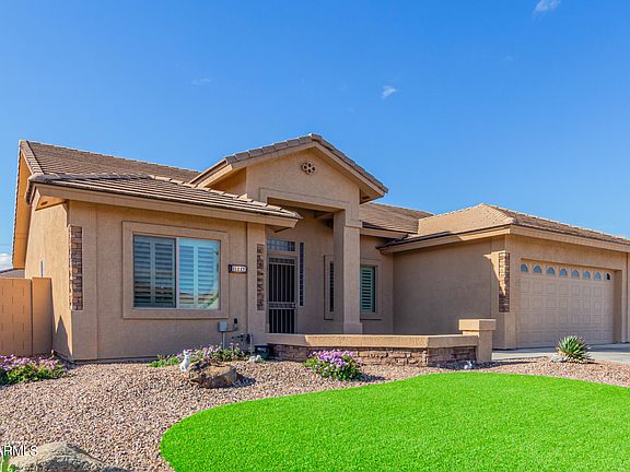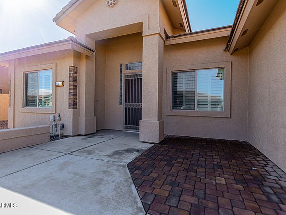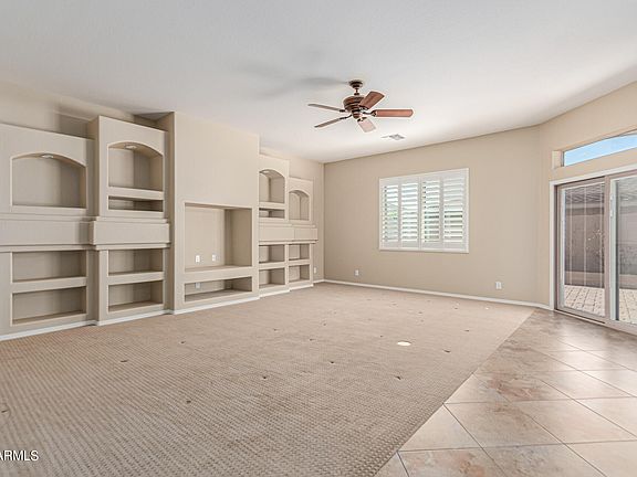 Welcome to this beautifully updated home in the sought-after community of Sunland Springs Village! This home has been lovingly cared for by its original owners. As you step through the elegantly designed security door, you'll be greeted by a bright and open floor plan that includes a spacious great room with an entertainment center wall, 2 bedrooms and a den complete with custom office furniture that will remain with the home. Inside, you'll find plantation shutters, neutral diagonally placed tile, ceiling fans in every room, and tasteful 2-toned paint. The stunning kitchen boasts Alder wood mesquite cabinets, Cambria quartz countertops, a custom tiled backsplash, stainless steel appliances, reverse osmosis system, walk-in pantry and breakfast bar. The owner's suite offers a large walk-in closet, raised vanity with double sinks, linen cabinets and a luxurious glass block walk-in shower. The laundry room is equipped with ample cabinets and a utility sink. The washer, dryer and refrigerator stay with the home. Head out to the garage and find tons of built-in cabinets with adjustable shelves plus a soft water system. Outside, you'll find low maintenance front and back yards, with synthetic grass in the front and pavers in the back. You'll love living in this beautiful community with a recreation center conveniently located right down the street! Residents can enjoy amenities that include golf, pool, spa, pickleball, tennis and much more! Don't miss the opportunity to live in this wonderful community!