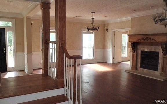Large house sits on hill overlooking wooded area and pond. From the columned, front porch, you enter the wide foyer; to the immediate right is a study / office and to the left is the dining area which is open to the kitchen. The kitchen is large and has plenty of cabinet space and a work island. Some major appliances will need to be replaced. Behind the dining room and kitchen is a large den with built-in book cases and a fireplace as its focal point. The master suit is accessed from this den and has a large bath with walk-in closet, toilet room, separate vanities, garden tub and separate shower. There is a second master on opposite end of this ground floor which has a dedicated bath and is reached through the kitchen and down a utility hall that houses sizable laundry room and a half bath. From either the foyer or kitchen, a shared landing begins the stairs to the second floor; these stairs reach a gallery which has French doors that open to a balcony with view of woods and pond and is perched beneath the front porch. At he opposite end of the gallery is a hall that runs the width of the house and gives access to two large bedrooms, each flanking the gallery on respective sides. At one end of the hall is a recreation room which has a wet bar and space for a small range; it also has a second laundry area. On the other end of the hall is the fifth bedroom which has French doors that open to a small deck with stairs leading to the side yard. Between the recreation room and the fifth bedroom, the outside wall of the hall has three full baths. The house needs some cosmetic work. The deck on the end of the house has been repaired and the septic tank was replaced just before listing.