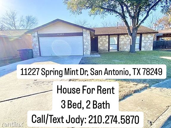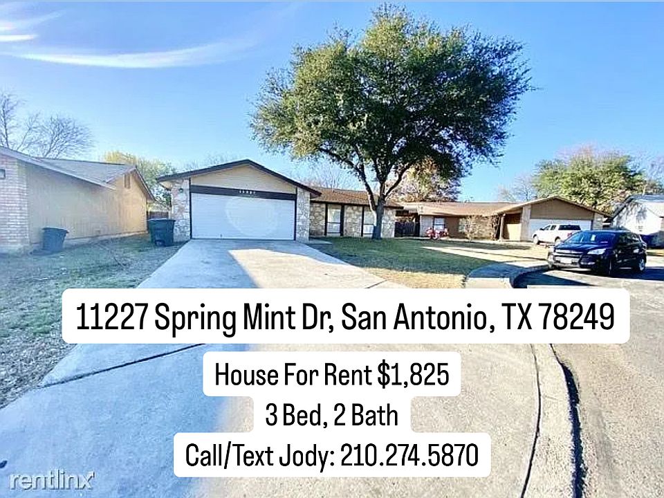 11227 Spring Mint Dr 78249 Fantastic Area Near Medical, Prue & Babcock rd! 3 Bed 2 bath House, Garage, fenced yard, Fully renovated, 1350 Sq Ft $1825 Monthly Rent $1825 Security Deposit RENTAL REQUIREMENTS: Monthly income of $5,500 or more NO evictions NO smoking Pets are allowed with a pet fee + pet rent No aggressive breeds per insurance **Bad Credit is considered with good income + good rent history. Must verify Call/Text Jody