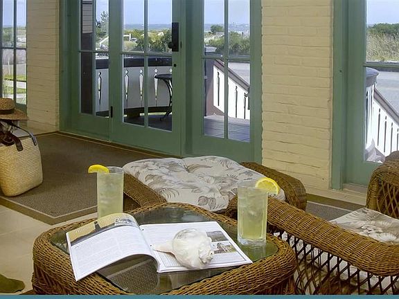 Timeless in a Waterfront position with spectacular views and beach access. This historic home is in perfect harmony with its waterfront location. Built from solid masonry/Stucco this handsome craftsman Swiss Chalet-style 'bungalow' has occupied this site, on a double lot, for over 100 years! A seamless flow between outdoors and in is created by the glass enclosed recessed porch, allowing light and sun to flood into the home. With two living levels, American heart pine floors and a soft neutral palette of creams and tones of nature create a neutral canvas to enjoy the views. The interiors include the sweeping grand salon with inglenook/fireplace with an open plan flow through the original pocket doors to the dining room beyond. A swing door at the rear of the dining room takes you into the spacious kitchen and butlers pantry, now being utilized as an office. It is now evident of the home's size and grandness. Upstairs, eight queen size bedrooms, each with ensuite, open to a central hall. One oceanfront Room has a small balcony overlooking the beach. Most of the rooms have views and two have gas fireplaces. The separate two-car Carriage House has an upstairs suite with wet bar in the living room and vaulted ceilings in the King bedroom. The basement level houses the laundry space and ample storage. The attic, that runs the full length of the house, is waiting to be transformed and has the best views! The home exudes comfort and a serene sense of timelessness with views that change daily. Positioned on the quiet side of town but within easy proximity to the action of Cape May, this property promises a lifestyle hard to match. The possibilities are endless.