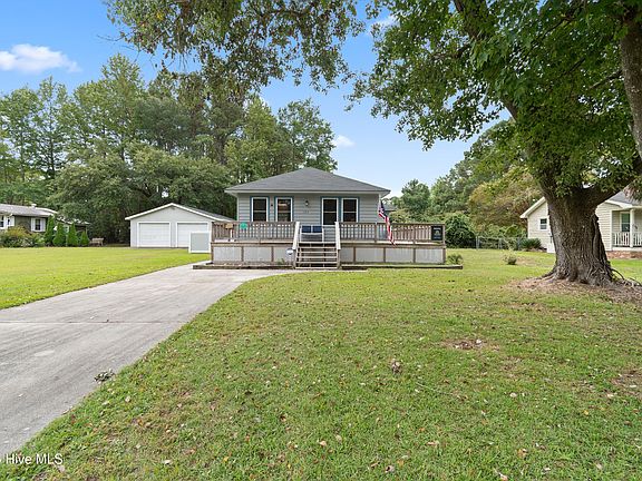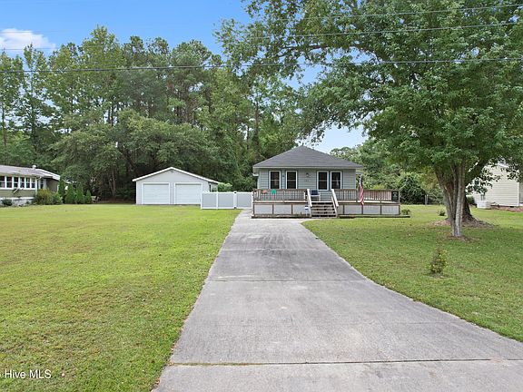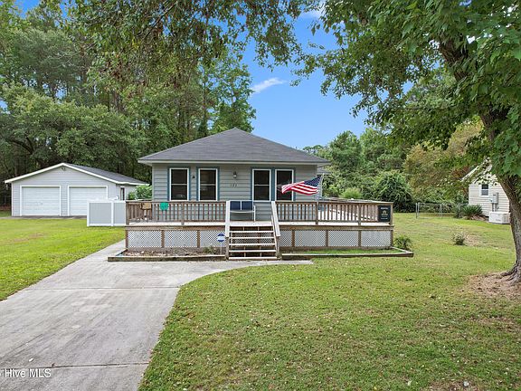 Welcome to 1123 Blue Fish Street, your next coastal getaway or primary residence. This 2-bedroom, 2-bath home is situated on a spacious double lot and is located less than 2 miles from award-winning Holden Beach! The detached two-car garage on the property provides ample storage or workshop space, complete with its own HVAC system, plus a separate bay for a golf cart or recreational vehicle. New vinyl fencing provides privacy and peace of mind, while the wraparound porch is perfect for your morning coffee or evening cocktail. Inside, you'll find beautiful hardwood floors throughout the living, kitchen, and dining areas. The spacious master suite features new LVP flooring and a separate room currently used as additional sleeping space—perfect for an extra bed, office, or lounge area. Off the rear, a bright and spacious sunroom brings in an abundance of natural light and is perfect for relaxing or entertaining. Even better—it's being offered fully furnished, hot tub included! With a brand-new HVAC system installed in 2025, this property is ready to enjoy as a personal retreat or investment opportunity. Holden Beach is centrally located between Wilmington and Myrtle Beach. Come and take a look for yourself today!