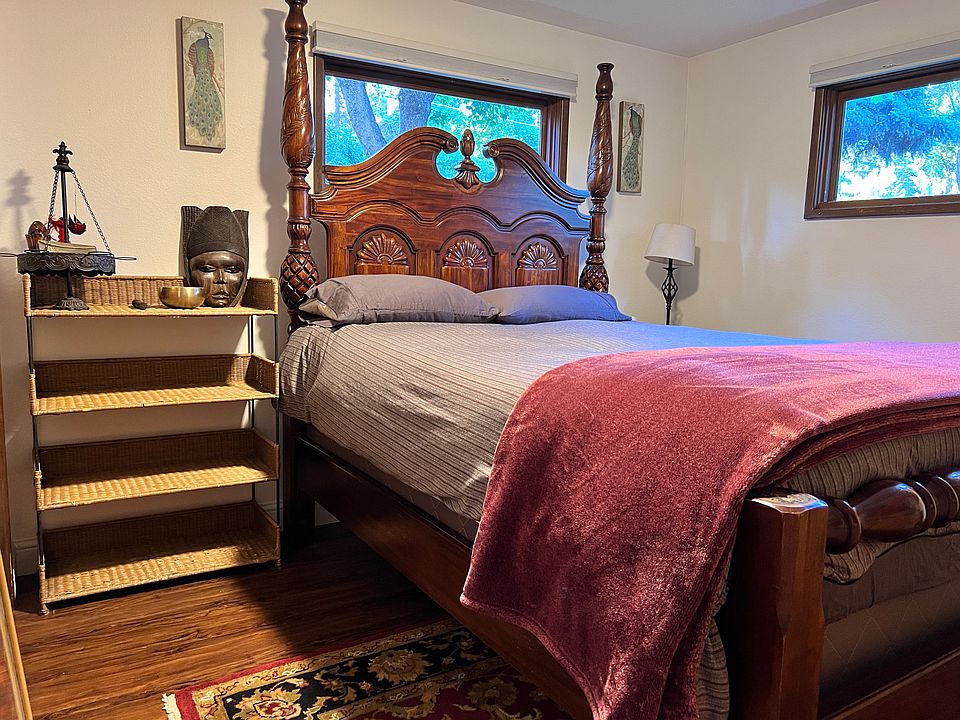 Private room in an exceptional home on Cherry Hill. The room has a private bath and shared common areas. The house is 2500 sq ft and includes full use of the kitchen, the movement room that includes a sauna, hot tub, and a place for morning or evening yoga/movement. The house was previously a retreat center. There is an unfenced quarter acre yard. The yard-care is shared by the household. The room available is currently furnished but can be emptied if needed. It comes with a queen size bed and some decor. It has a standard size closet and is located on the bottom floor with access to a private door. Although you'd be welcome in and out of any door. Current residents in the house are myself, 58 year old retiring massage therapist, and my 19 year old daughter. We also have chickens, a cat and one quiet dog. No other pets will be considered. The home is created to be a zen respite for anyone living here. We would love to share it with you. Month to month Requires a background check No smoking on the property