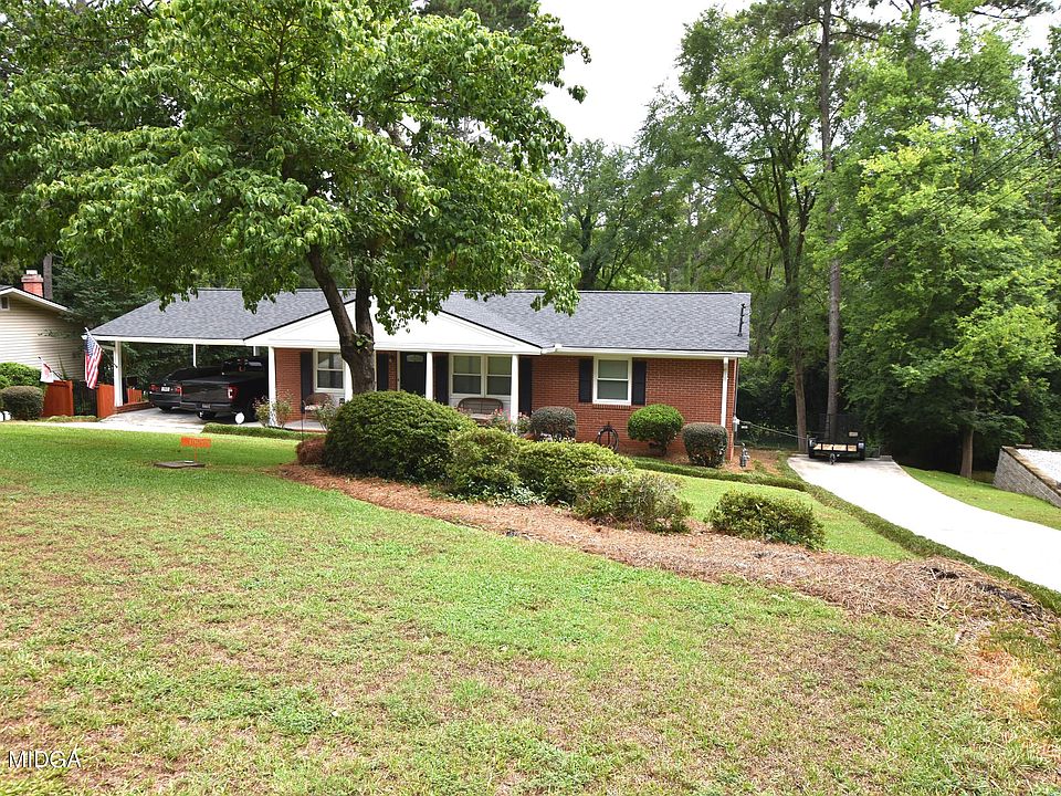 Just charming. Step into comfortable when you enter this 3-bedroom, 2 full bathroom home with an extra driveway for additional parking. Full brick, one level with new roof, 2 living spaces, updated kitchen, updated bathrooms, newer energy efficient windows, and mostly hardwood floors. Covered rear porch with a view of nice, fenced backyard. Additional patio garden area with privacy. Southern front porch to enjoy.