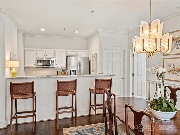 Welcome to this delightful 2-bed, 2-bath condo in the vibrant heart of Dilworth. An open floor plan creates seamless flow for comfortable living & entertaining. The living room features a cozy gas fp, complemented by rustic wood accents & a built-in bookshelf. Kitchen includes granite countertops, subway tile backsplash, SS appliances, large pantry & an eat-in breakfast bar. Primary suite boasts plantation shutters, spacious walk-in closet w/ storage, & large bathroom w/ modern updates. Oversized, secondary bedroom also features a walk-in closet, plantation shutters, & access to the covered porch. Hall bathroom is a designer’s dream, w/ playful wallpaper & updated lighting. The covered porch offers an ideal spot to relax outdoors. An in-unit laundry room is a rare find. Outside, enjoy the ease and security of a one-car detached garage. NEW HVAC 2025. Roof '22. Enjoy the convenience of being blocks from the shopping, dining, & energy of Park Road Shopping Center / SouthEnd.