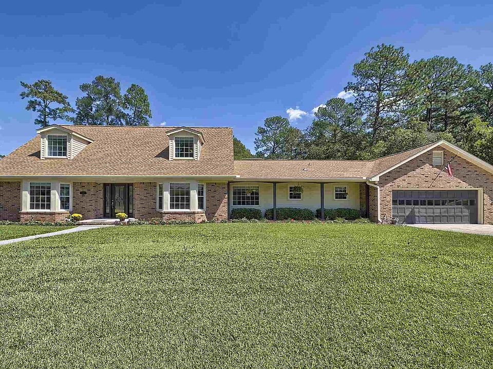 Spacious, well maintained and updated home in a quiet settled area that's convenient to shopping, dining and the interstate. Beautifully landscaped yard with sprinkler system. Wonderful leaded glass front door with sidelights welcomes you to the open foyer. Hardwood floors run through the foyer, formal dining room, kitchen, living room and back hallway. New carpet in large formal living room. Bay windows in formal living and dining room. Large eat-in kitchen with granite counters, upgraded stainless steel appliances, and plenty of cabinet and counter space also has a pass through to the living room. Living room has beams, fireplace and built-ins. Tile floors in all bathrooms and laundry room. Laundry room is large with utility sink and plenty of extra space. Large master has his and her closets as well as a dressing area with vanity. All secondary bedrooms are large and feature ample closet space. Flex space room behind garage could be workshop, workout room, hobby room, etc. Separate utility room as well. There are tons of storage space throughout this home. Large fenced-in backyard that backs up to a wooded area. Large patio are can also be used as a basketball court. Separate storage shed/playhouse. You truly MUST SEE this house to appreciate it!