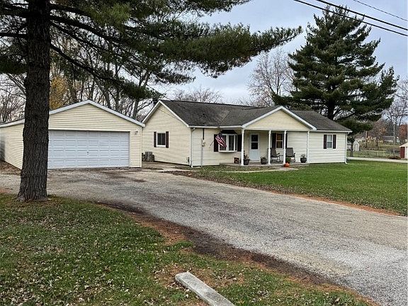 Enter from a covered porch into an inviting great room/Family room with brick fireplace wall and wood burning fireplace. (Gas has been ran to the fireplace as well but not hooked up). Built-in corner tv shelf. Patio sliders to back deck (10x14) and approx 1/2 acre corner lot with mature trees. (Back wood fence is not on property line. Property line is 8' on this side of the fence). Beautiful, light and airy kitchen with Schrock cabinets and brand new countertops! Also, a nifty, enclosed bread drawer! Modern 3/4 bath off of main bedroom. New carpet in all bedrooms. There is a dishwasher in the garage that will stay with the property if buyer wants it. Owner has paid for a new roof and will be installed when weather permits. 8X20 covered front porch. Fantastic 4-car (20x46) detached garage with double doors on front and back ,220 wiring, furnace and built-in air compressor. Perfect for workshop. Separate 8X16 storage shed for lawn equipment. Fantastic location - minutes from shopping, grocery, restaurants.