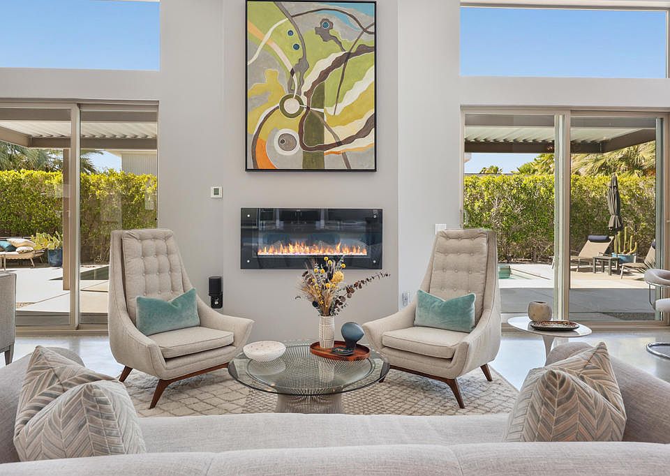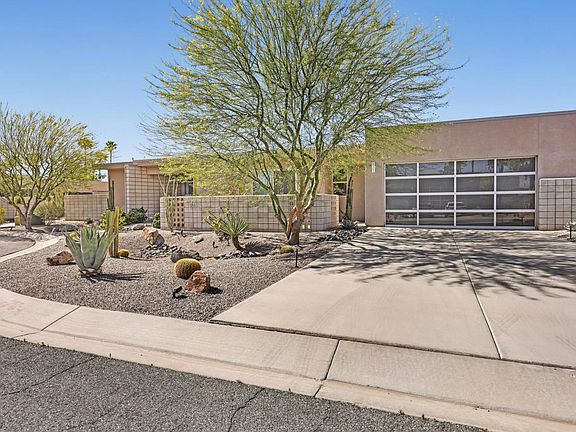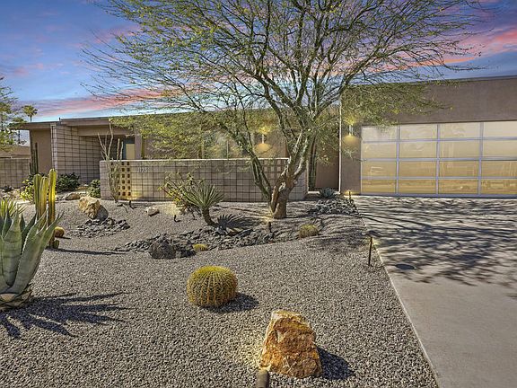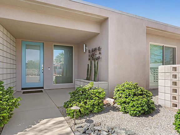 Echoing classic design cues that draw so many to Mid-Century Modern architecture, this move-in-ready home at Murano in Palm Springs was built in 2014 and seamlessly incorporates the most desirable appointments of today. Set at the end of a cul-de-sac street and embraced by beautiful views of the San Jacinto Mountains, the spacious single-level residence makes an appealing first impression with professionally designed and maintained desert landscaping, a covered front entrance, and a two-car garage with sleek glass roll-up door. Indoors, ceilings soar high above living areas that span approx. 2,312 s.f. Clerestory windows, polished concrete flooring, an open arrangement and abundant lighting. California Closet buildouts throughout the house and garage. Opening to a private backyard with pool, spa and a covered patio, the great room is massive and presents a linear fireplace and generous space for seating and dining areas. The great room blends seamlessly with a high-end kitchen that displays a dual-waterfall island with seating, contemporary high-gloss white cabinetry, stainless steel Bosch appliances, a pantry, and a full tile backsplash. Three bedrooms and three bath include a secondary primary suite, and a grand owner's suite with walk-in closet, patio, high ceiling, soaking tub, walk-in shower and two sinks. Most rooms in the home open to the outdoors, and further enhancements are led by a block-style accent wall in the great room, custom paint, and owned solar power.