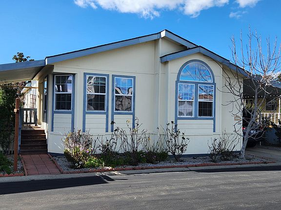 This is a newer home built in 2003 with a large gourmet kitchen with oak cabinets and Corian type solid counter tops with molded sink . Breakfast nook and formal dining room ! Vaulted cielings with fireplace in the living room . 3 bedrooms with the largest having a walk in closet with large soaking tub and seperate shower and dual seperated sinks . Rose garden in the front yard and lots of fruit trees in the back yard with nice sized locking storage shed . Blinds thru-out , dual pane windows , washer , dryer and stainless steal refrigerator included !