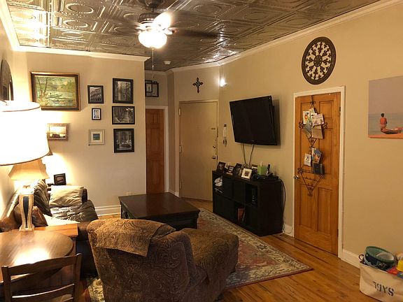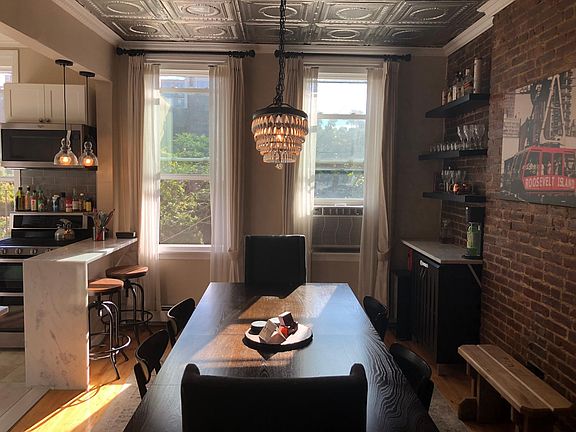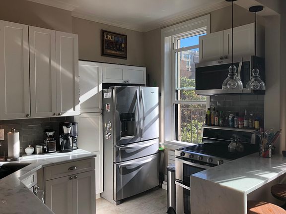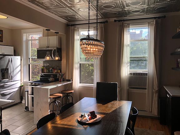 1-month free now being offered on a 13 month lease! Net effective rent shown; gross rent $3,300. Beautiful two bedroom floor-through apartment with hardwoods throughout and nearly 1,300 square feet. Top floor unit with extra large windows allows ample natural light in all rooms. Very high 10ft+ ceilings. Renovated kitchen with SS appliances, marble countertops, breakfast peninsula and dry bar. Oversized dining room flows into large living area. Two oversized bedrooms with plenty of storage. Brand new washer and dryer within the in-unit laundry room.