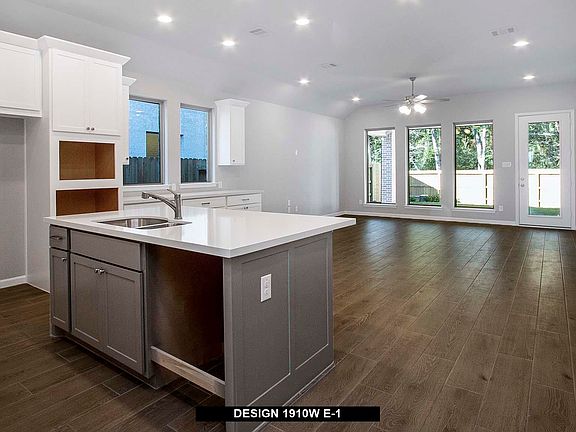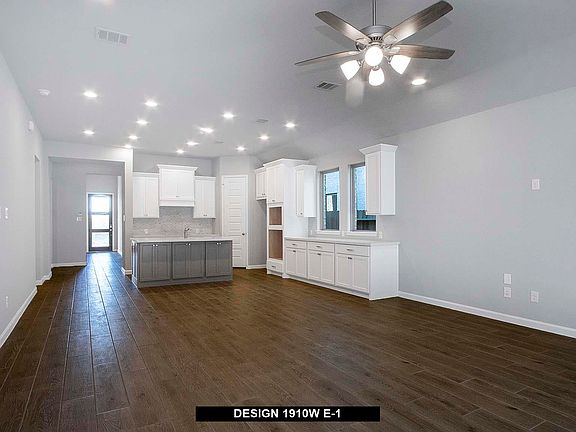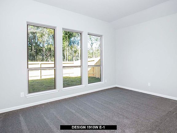 Entry flows to the kitchen, utility room, dining area and family room. Home office with French door entry. Island kitchen with built-in seating space and a generous walk-in pantry. Open family room with three large windows. Primary suite offers a spacious bedroom, double door entry to primary bathroom, dual vanities, garden tub, separate glass enclosed shower and a large walk-in closet. Guest suite with full bathroom and a walk-in closet. An additional bedroom, bathroom and a utility room complete this design. Extended covered backyard patio. Mud room just off the two-car garage.