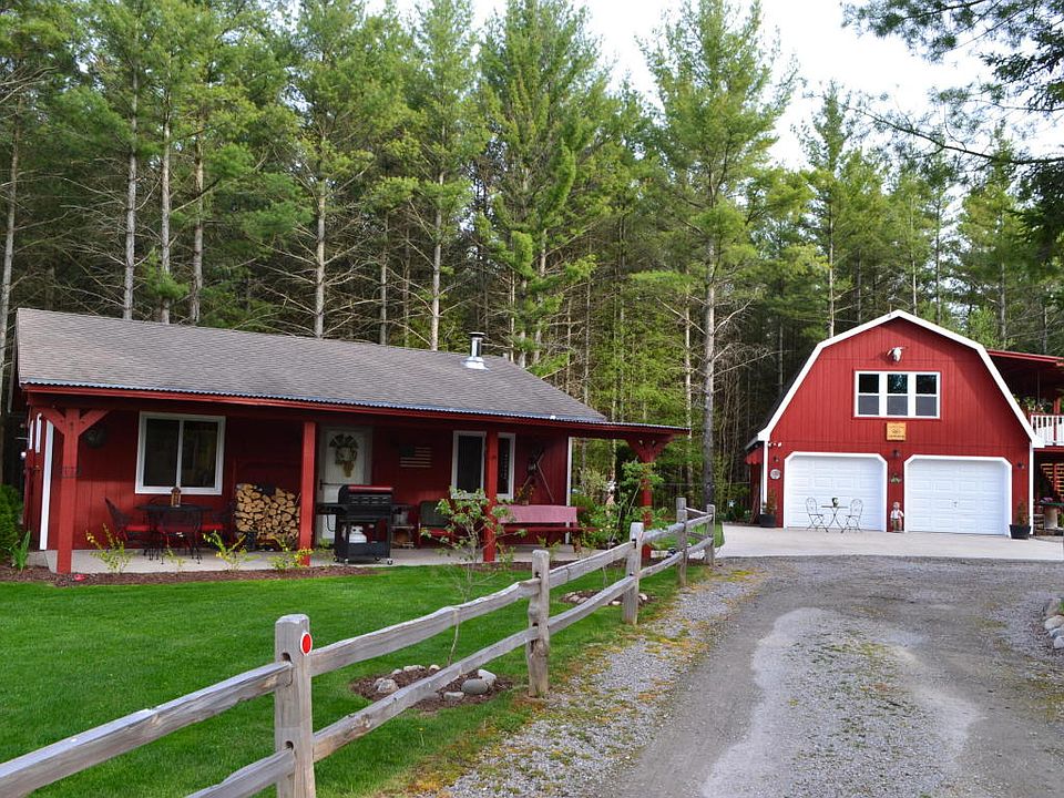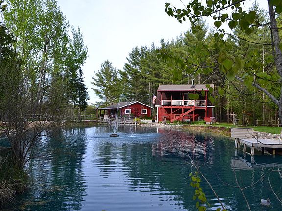 Own this unique up north property, nestled into a secluded 3.8 wooded acres, not far from state land. Beautiful landscaping, large stocked pond (bass & catfish) with fountain. Main 700 sq.ft. home has 1 bed & 2 baths, tile flooring, newer appliances & in-floor heat & custom finishings. The 670 sq.ft. guest quarters is a 2 bed, 1 bath with hardwood floors and wood stove. 24x28 Garage has in-floor tubing installed, power and workshop are with guest quarters above. All buildings come fully finished & a covered porch, just take off your shoes and leave your worries at the door.