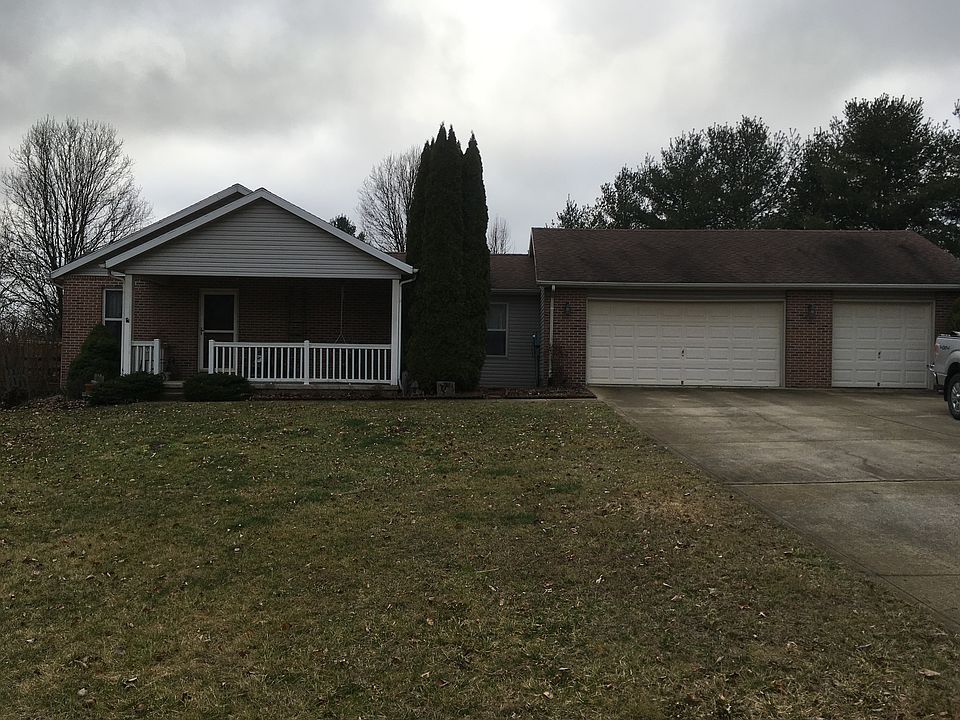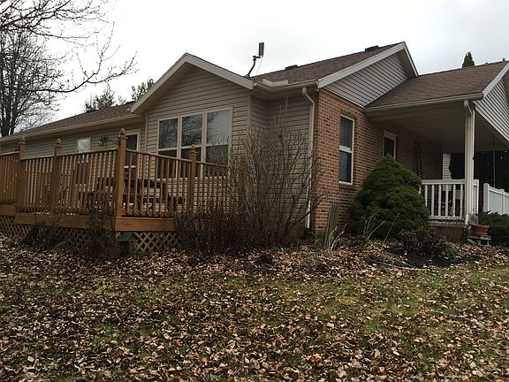 Well maintained brick and vinyl home that sits on approx. 1 acre on a quiet cul-de-sac sac. Three bedrooms, two baths and a large open living area with cathedral ceiling. Natural gas heat( budget payment $57 a month) city water and septic. Newer kitchen appliances , tile back splash. Master bath has recently installed tile floor and newer vanity and faucets. Newly added bronze ceiling fans, lights and interior doorknobs throughout.Three bay garage with a workbench in the separate 3rd bay. Two Amish built sheds, fenced in back yard and plenty of room for a garden along with three mature apple trees, grape arbor and a pear tree. Large deck on side of home, which faces the large lawn that is great for corn hole, volleyball or just enjoying. Covered front porch and a private rear patio. The rear of the property is lined with pine trees for added privacy.