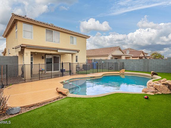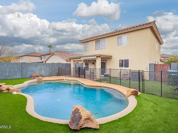 Spacious concept lower level is open and airy, bathed in light for relaxed living. First floor owner's suite provides convenience, safety and security. Bright, updated kitchen with sparkling granite counters overlooks the private back oasis including a sparkling pebble tec pool and shaded back patio for lounging. Mature ez care landscaping so you keep lounging! Fresh modern grey paint shades promote calm, casual living. Upstairs a roomy loft area with a hundred handy uses, nicely spaced bedrooms and a convenient full bath. Built in garage storage offers a place for everything. Walk to Camelback Ranch facility and parks. Near State Farm stadium, Shops and Westgate, Tanger outlets. Easy access to 101 or 10 freeways. This home has been lovingly cared for.