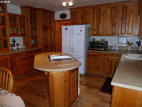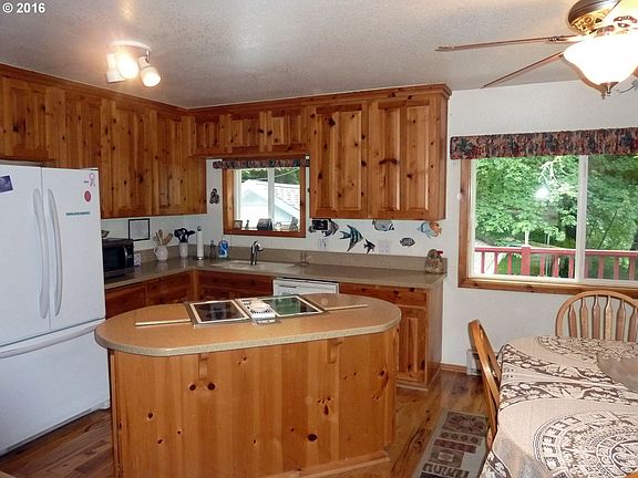 River front home surrounded by green lawns, fruit trees, & native vegetation. Bonus room could be office/guest room. Kitchen features natural wood cabinets & built in hutch. Living room has vaulted ceiling, skylight, ceiling fan, & pellet stove. Enjoy excellent river views on the deck that runs full length of home. 2 separate garages w/ shop space & an RV port w/ full hook-ups. New carpet in bedrooms.