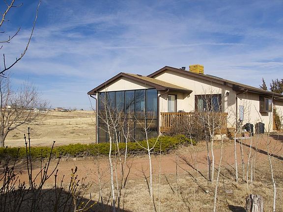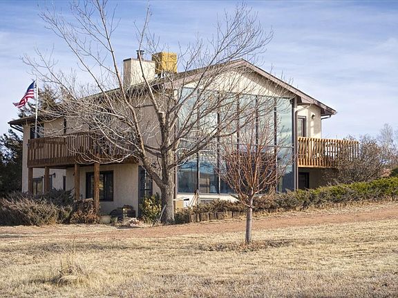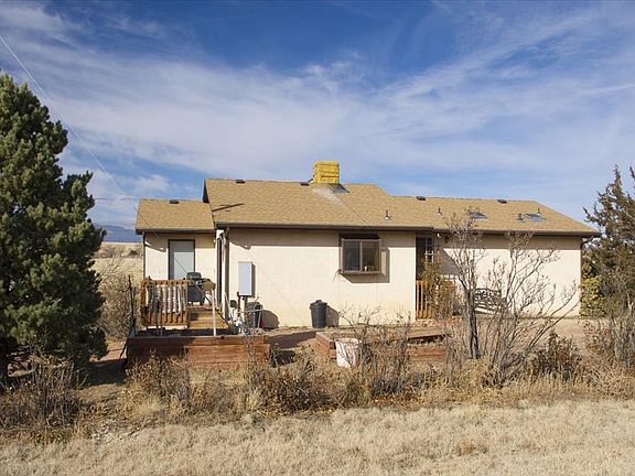 Wow - nice floorplan with this hidden gem with a large rolling lot! Walkout Kitchen with Corian counters, tile backsplash, tons of cabinets, vaulted LR with walkout to 20'x6' west facing deck. Two bedrooms on main, plus 2 bedrooms, rec room with wood stove, and office/5th bedroom on lower level. Low maintenance exterior with newer roof and evaporative cooler, stucco siding. Low heating bills with in-floor radiant heat plus 2-story passive solarium with exterior/interior thermostat controlled venting. Circular drive, large loafing shed and extra storage sheds, oversized 3 car garage with workshop area. Sitting area with pergola. Peak and front range views all the way down to the Sangre de Christo range.