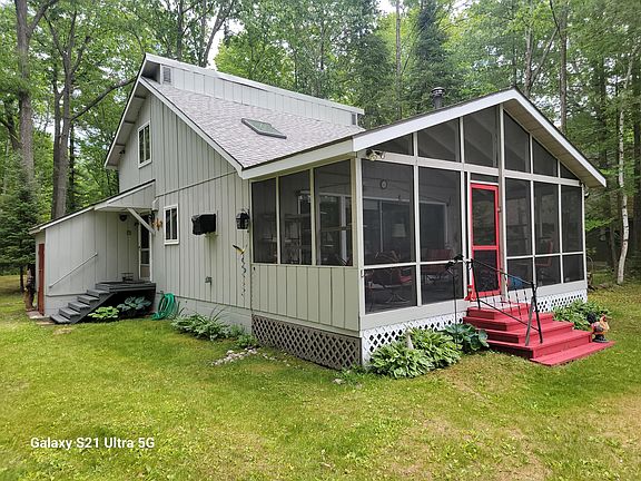 80 ft water front home with million dollar view. This 3 bedroom 2 bath cottage is a year round home with 3 sources of heat, Propane, Wood and electric. Spiral staircase leads to 2 bedrooms and a bathroom. Master bedroom in on main floor. Vaulted ceilings with skylights, sliding glass doors offer view of lake. State land on 2 sides. Many updates include, drain field, fill dirt, grass, flowers, tree removal, repaired dock, exterior paint, Floors, sinks, toilets, hot water heater, wall furnace (2-3 years old), cabinets, ceiling fans, kitchen counter, faucets, window treatments, screened porch, carbon monoxide and smoke detectors, custom blinds, well approximately 8 years old.