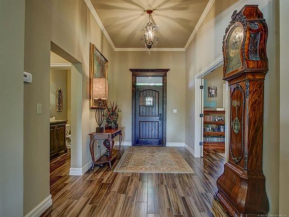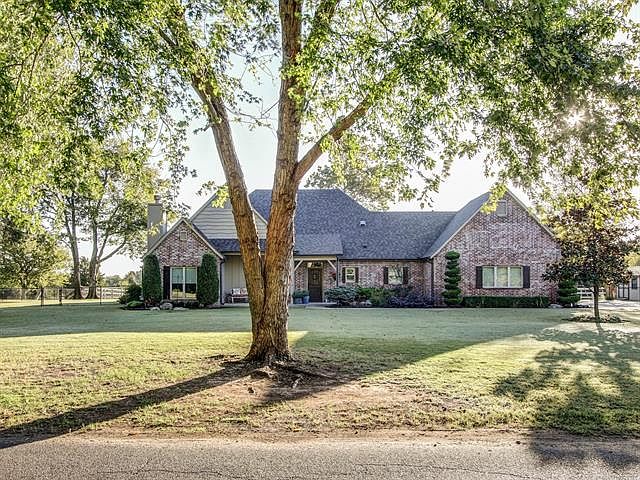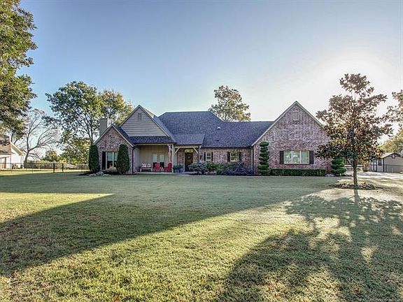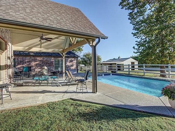 Incredibly rare country living in city of Jenks. Horses permitted & encouraged on this 1.5 acre lot (M/L) that is fenced & cross fenced with horse stable. Custom built single story with gunite pool is loaded with extras. Open plan has chef's kitchen, expansive dining area & vaulted & beamed family room. Separate den with pine ceiling & wood burning fireplace. Private office. 3 large bedrooms all with private baths. Full brick, tankless water heater, foam insulation, extra parking for RV or horse trailer.