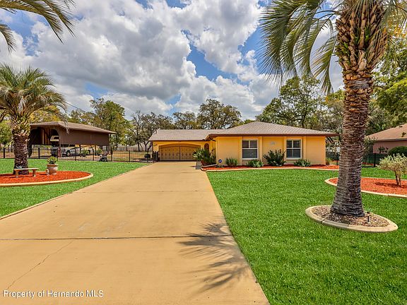 Active Under Contract. THIS HOME HAS IT ALL! Remodeled and upgraded 3 bedrooms + 3 full bathrooms +2 car garage + private pool + fireplace + RV Carport + Large shed with concrete floor + DOUBLE LOT -- over an acre + on a PAVED road!! NO HOA!! Bring all your toys...boats, campers, AVTS, bring it all. New Roof. Newer windows, sliders, doors. Beautiful ranch-style home with rock, wood-burning fireplace! Open floor plan and high ceilings make this home feel spacious, light and bright! Views of the pool from your triple, glass slider! Kitchen is remodeled and upgraded with granite countertops, built-in desk, breakfast bat, newer appliances, and is open to the nook, great room, and dining room! Nook as built-in cabinets and granite countertop for a serving bar and extra storage! Ceramic tiles throughout the home! Wood beam ceiling!! Spacious master bedroom (14x11.5) has ensuite bathroom with updated cabinets and countertop/sink. Walk-in shower! Second bathroom is updated and upgraded with granite countertops and a shower/tub combo. Third full bath is in the garage for pool access or to shower off after being outside...or convert the garage into another huge room with attached bath. Large covered patio (20x12) offers lots of covered area for entertaining or relaxing by your private pool. Large RV carport to store your RV, camper, or boat out of the sun and elements. Large shed has concrete floor and can be a 3rd garage. Fenced for family or pets! All sitting on over an acre! Zoned for the newest schools...Winding Waters K-8 and Weeki Wachee High School.