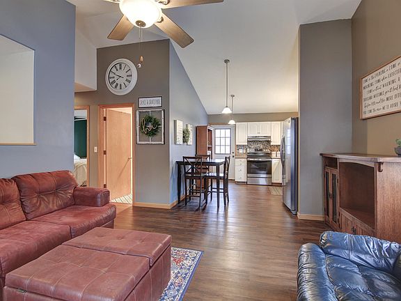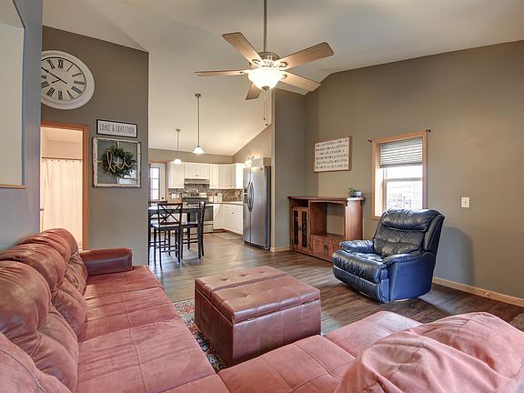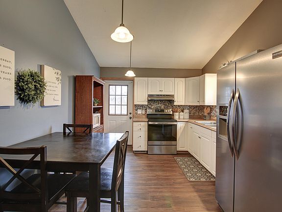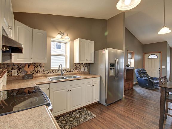 Quality built steel frame home in 1998. Inviting entry with soaring ceilings and open concept to kitchen. Stainless steel appliances stay. You will love the deck which overlooks the tranquil backyard. Lovely flooring and fixtures throughout main level. There are laundry hook-ups on main level but current seller has laundry in the basement. Lower level is finished with a 1/2 bath. You could make a third & fourth non-conforming bedrooms in the basement. The basement has a walk-out to a lovely patio with easy access to the garage. Fenced yard for your furry friends.