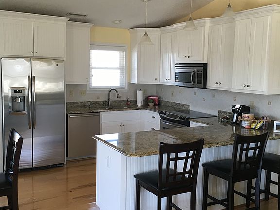 Totally remodeled 2009 new custom cabinets granite tops tile floors in baths hardwood floors living room kitchen and hall carpet in bedroom Wonder sunset view right on banks channel Short walk to beach Very well kept house
