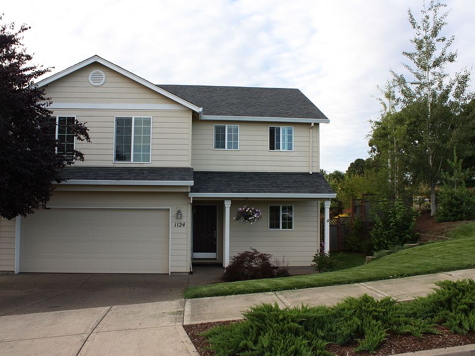 Meticulously clean, move-in ready Hm at the end of 14th St; corner lot location w/Mtn & Sunset views out back, Hazelnut orchard across street & privacy. 4 bedrms & 2.5 bath w/great rm concept, high quality Pergo floors t/out first floor, SSApl, 0 edge slab granite, gas firepl w/cultured stone. 2 car garage,yard w/fruit trees, blueberry bushes, raised garden beds, brand new fence w/2 gates, stone wall & patio w/sprinkler & drip system.