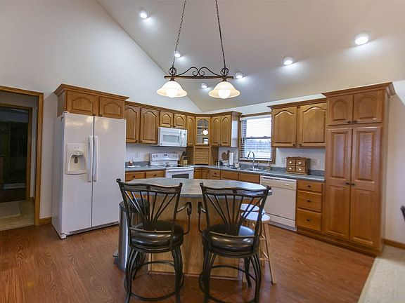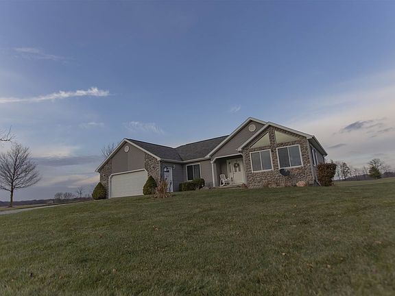 This amazing ranch home on a full finished basement boasts over 2800 square feet of living space and sits on 5.6 peaceful acres in the outskirts of Angola. You will love the open concept main level with its vaulted wood beam ceiling, 25' x 13' living room, large kitchen with plentiful cabinets, island, and double-basin stainless steel sink with gooseneck faucet, and dining area overlooking the backyard and deck. French doors lead to a home office, also with a vaulted ceiling, and filled with abundant natural light. The master ensuite is tucked far enough away from the main living area and has a large walk-in closet and full bathroom. Another bedroom, a second full bath, and a laundry/mudroom/half bath round out the first floor. Walk downstairs to the finished daylight basement, with two expansive rooms that could be used for anything from a kids playroom, home theatre, exercise room, man cave, a second family room, a hobby studio-- you name it! There is also a third sizable bedroom with a walk-in closet, a full bathroom, and several unfinished areas for storage and access to the mechanicals. If this wasn't enough, the most impressive and unique feature of this property is the 57' x 69' finished pole barn with concrete floors, two 14' garage doors and a 10' door, radiant heat, an office, and plumbed for a bathroom. With 3933 sq ft of space, the outbuilding can store or be used for anything you can imagine.