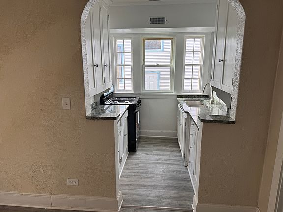 Four-unit property featuring Units #1 #4, each offering 1 bedroom, 1 bathroom, a galley kitchen, a small dining area, and a compact office. Each unit rents for $950 per month. Tenants are responsible for electricity and gas (ComEd & Nicor). No garage is available, but on-site parking is included.
