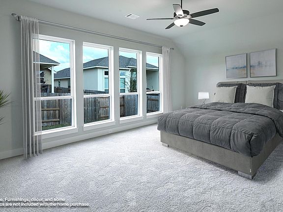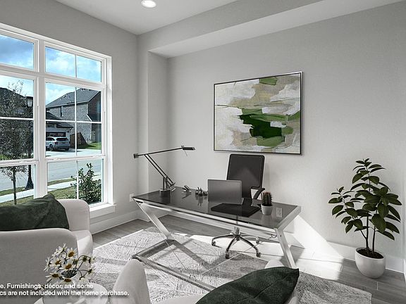 Home office with French doors frame the entry. Extended entry flows into the family room, kitchen and dining area. Island kitchen with built-in seating space and a corner walk-in pantry. Spacious family room with a wall of windows and a fireplace. Primary suite with a wall of windows. Primary bathroom features a French door entry, dual vanities, garden tub, separate glass enclosed shower, a linen closet and two walk-in closets. Additional bedrooms with walk-in closets, a guest suite with full bathroom, and a utility room complete this spacious design. Extended covered backyard patio. Mud room just off the three-car garage. Representative Images. Features and specifications may vary by community.