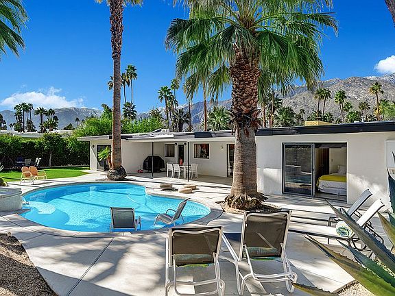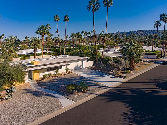Located in Deepwell, one of the best neighborhoods in South Palm Springs, this 1956 Mid-Century modern home has the ultimate indoor-outdoor living. 3 En-Suite BDs (2BDs in one wing, and 3rd BD on the other), 1,971 SqFt, open great room w/beautiful midcentury style fireplace, stunning concrete floors, remodelled kitchen set the stage for another perfect Desert getaway. The main living room w/large windows allow for just the right amount of light to flood the interior space while also providing picture perfect views of the San Jacinto Mtns. Architecturally, the home enjoys simple lines consistent w/the period of Desert modern architecture for which Palm Springs is so well known. On an oversized lot, 11,326 SqFt, generous backyard w/palm & citrus trees frame the pool & spa creating a special environment for entertaining visitors or quietly lounging by oneself just taking in the view. On land you own, walking distance to downtown, shopping, restaurants, golf, tennis, biking, hiking trails.