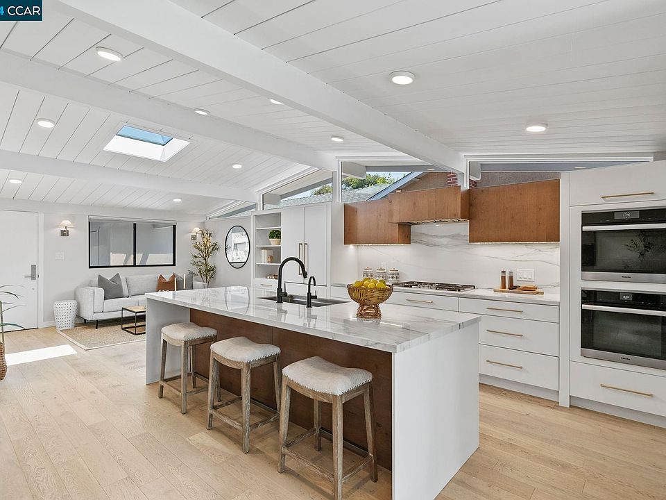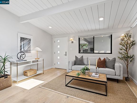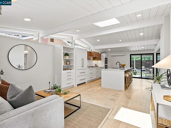 Presenting a meticulously restored mid-century modern gem, remodeled down to the studs in 2019 with full city permits. The kitchen and great room were designed and transformed by MKB Design and Management. The kitchen features quartz countertops, a large island, custom cabinetry from Distinctive Cabinetry with designer hardware, and premium Miele appliances and an Electrolux wine refrigerator. Bamboo hardwood floors run throughout. Large windows flood the home with natural light, along with vaulted ceilings amplifying the space. Both the primary and hall bathrooms were completely redone, meaning every surface of the house has been updated. A new office/studio/ADU in the backyard, designed by MKB designs, offers versatile space for work or guests. Over $400K has been invested in this home's restoration, including new Marvin double-pane windows, a tankless water heater, new sewer lateral, custom cedar and redwood fencing, energy-efficient mini-split heat pumps and air conditioners, and upgraded plumbing, electrical, and insulation. The private backyard, with a lush lawn and patio, is perfect for relaxation. Convenient access to Highway 680 and BART makes commuting easy. This 3-bedroom, 2-bathroom home blends mid-century charm with contemporary luxury and functionality.