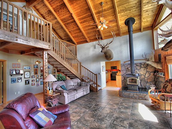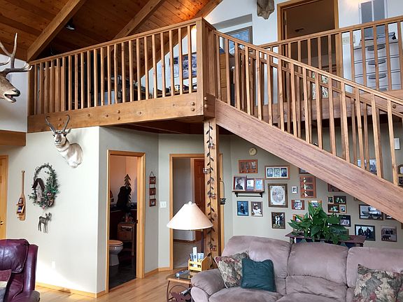 Large cedar home with a beautiful view of the mountains and lake. 256 feet of lakefront complete with boat launch and dock. This home features 18 ft vaulted ceilings in the living room overlooking the lake. Also an open kitchen with bay windows, large island and eating bar with walk-in pantry. Dining area opens to the family room in this exquisite home. Master suite upstairs with walk-in closet. Master bath has double sinks and jetted tub. Private den or workout room also with lake view and sliding glass doors. Top it all off with a detached, roomy shop and ample parking.